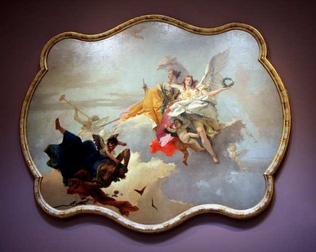 Giovanni Battista Tiepolo was the purest exponent of the Italian Rococo. He created fresco decorations and paintings for palaces and churches throughout Europe with an unprecedented, inventive freedom of form and expressive, shimmering colors. A master of the airborne figure and of perspective, he excelled in creating the illusion of infinite space articulated with luminous colors and atmospheric effects. This painting was designed for a ceiling in the Palazzo Manin in Venice. Virtue is dressed in white with a sun symbol on her breast. Beside her, Nobility holds a statuette of Minerva and a spear. To the left, Fame blows her trumpet. Below, the figure of Ignorance is being vanquished. The poppy wreath falling through the sky alludes to the “sleep of the mind.” The bats symbolize ignorance, which refuses to see the light of wisdom and knowledge. The figures of Virtue and Nobility display a distinctly lofty, detached air indicative of the mythological world they occupy.