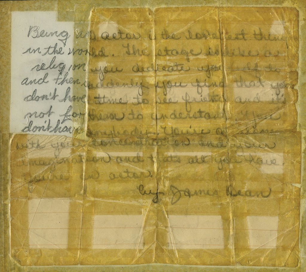 “Being an actor is the loneliest thing in the world. The stage is like a religion you dedicate yourself to and then suddenly you find that you don’t have time to see friends and it’s not for them to understand you don’t have anybody. You’re all alone with your concentration and your imagination and that’s all you have. You’re an actor. by James Dean” — This note was written in New York City at Blaty’s Restaurant in 1952. Live Auctioneers