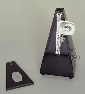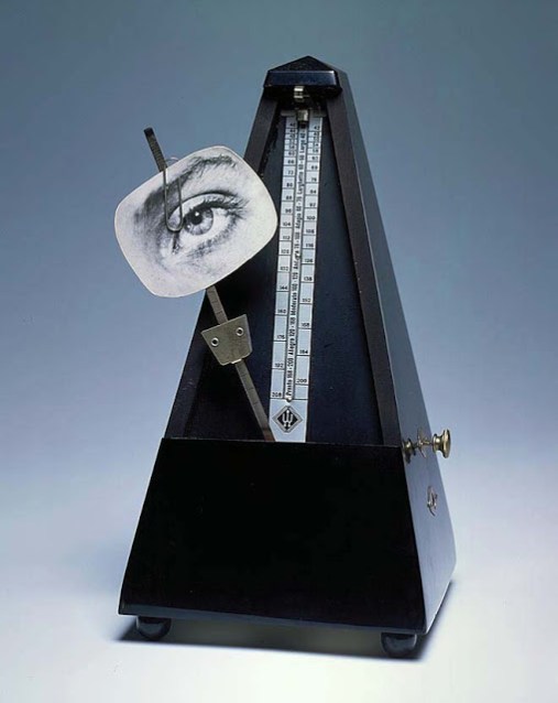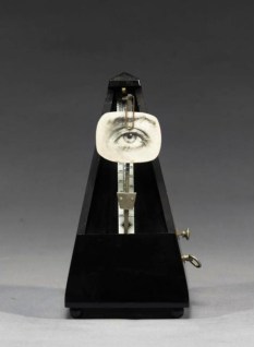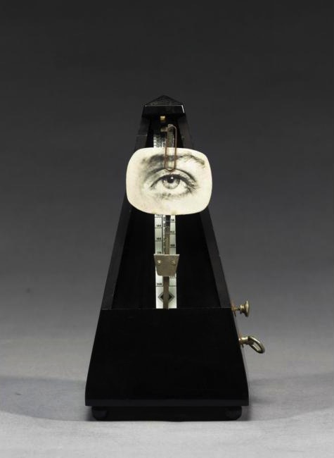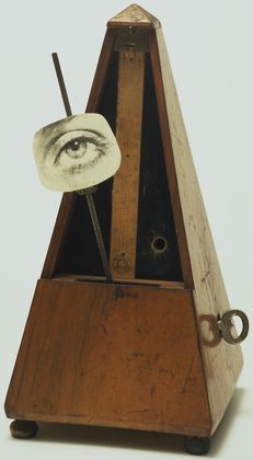 Man Ray’s celebrated combination of a metronome with a photograph of an eye affixed with a paperclip to the swinging arm was first created in 1922-3 and titled Object to be Destroyed (Objet à détruire). As Man Ray later explained: ‘I had a metronome in my place which I set going when I painted – like the pianist sets it going when he starts playing – its ticking noise regulated the frequency and number of my brushstrokes. The faster it went, the faster I painted; and if the metronome stopped then I knew I had painted too long, I was repeating myself, my painting was no good and I would destroy it. A painter needs an audience, so I also clipped a photo of an eye to the metronome’s swinging arm to create the illusion of being watched as I painted. One day I did not accept the metronome’s verdict, the silence was unbearable and since I had called it, with a certain premonition, Object of Destruction, I smashed it to pieces.’ (Schwarz, p.206.)
