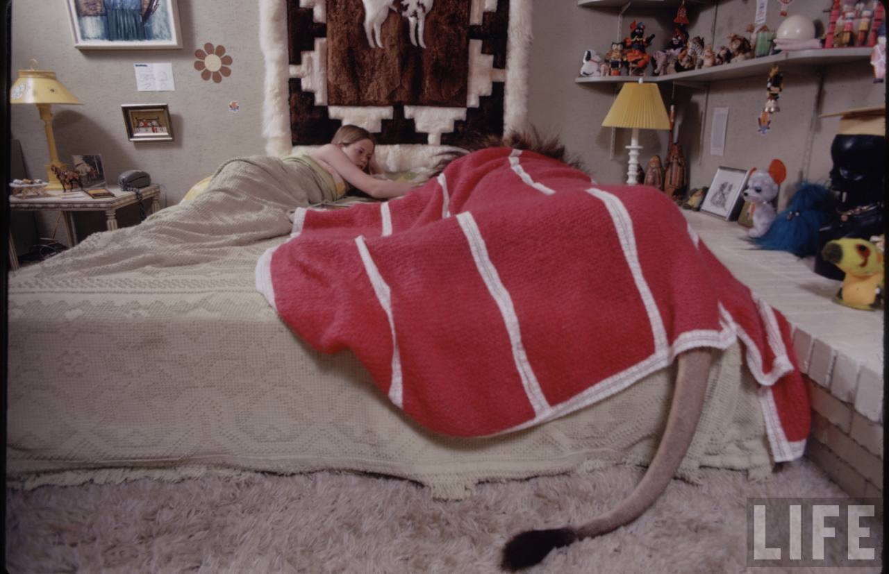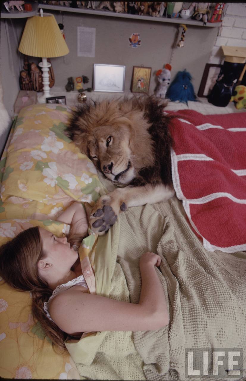 The Marshalls had three children. Melanie would be about 11, and two stepsons, They were as comfortable with these wild creatures as they would have been with Beagles. We made a charming photograph of Melanie (today Mrs, Antonio Banderas) sound asleep curled up with one of the big lions. We photographed the kids swimming with the cubs, the pool full of them and every one dog-paddling (or should it be cat-paddling?) to beat the band.
