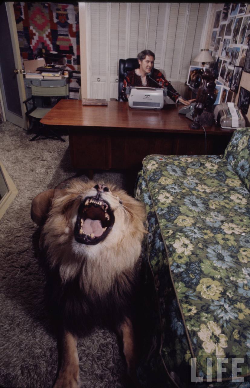 I look up and here’s this guy — this flack — who has been driving me crazy with his constant calls about Tippi Hedren and the movie she’s going to make in the African Veldt. And standing behind him because it’s almost too big to get through the door is a lion, a huge, black-maned African lion. Its mouth is open. Its teeth are on display.