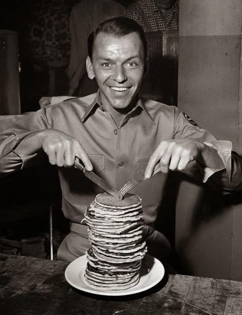 Frank Sinatra digs into a tall stack of pancakes during the filming of From Here to Eternity, 1953